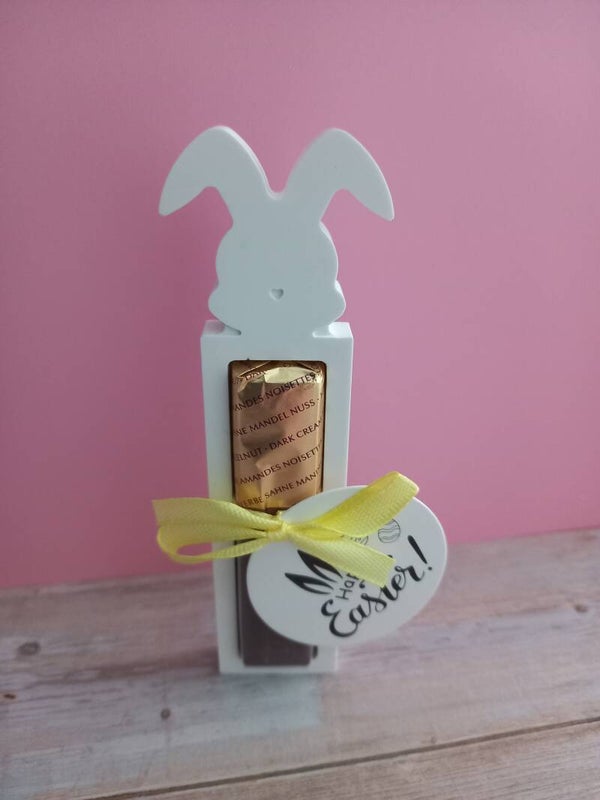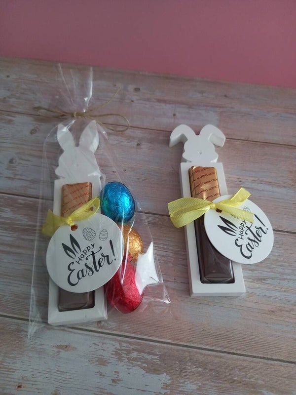 Leuke handgemaakte konijntjes met merci chocolade in .