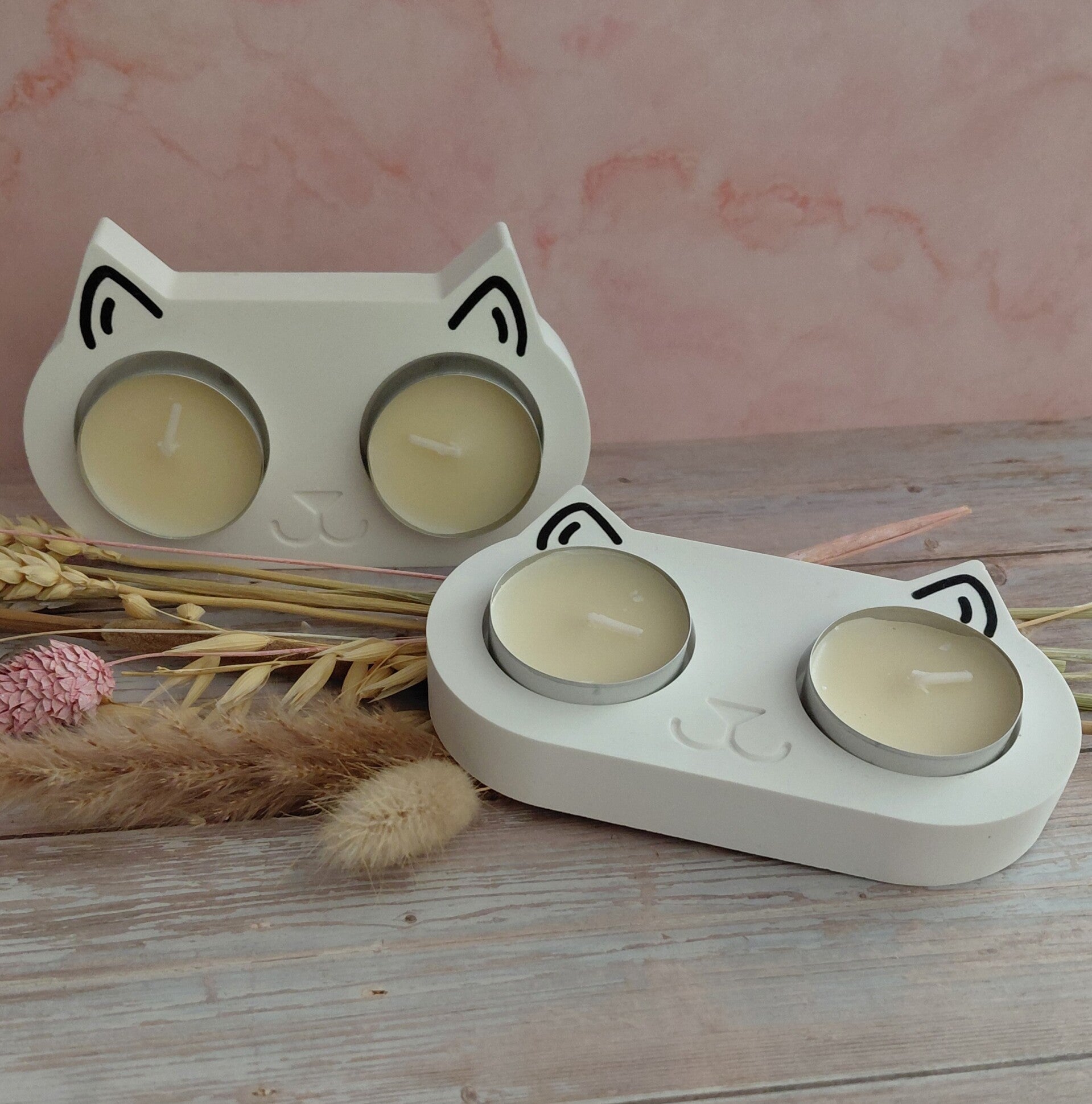 Handgemaakte theelichthouder in een vorm van een kat.