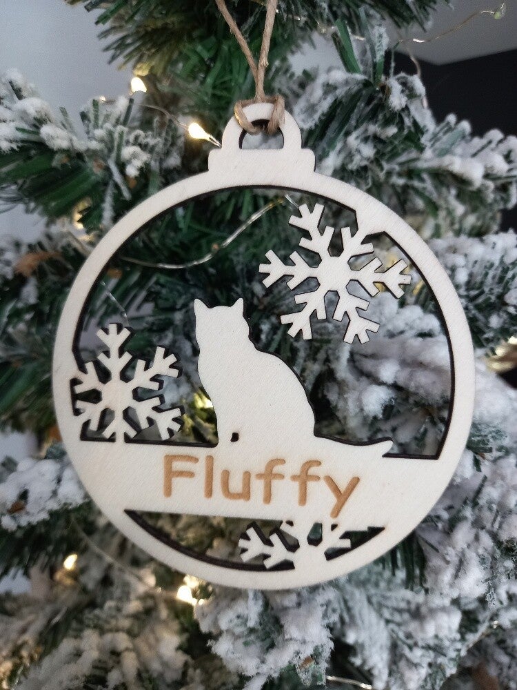 Gepersonaliseerde houten kersthanger met naam van je katin gegraveerd.