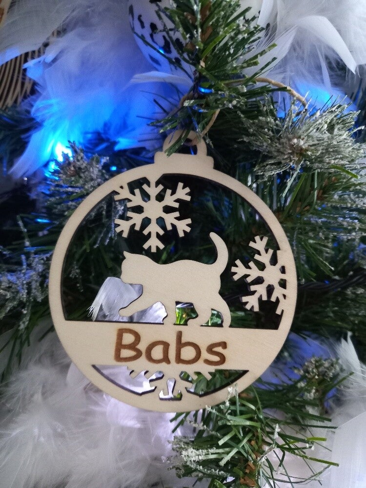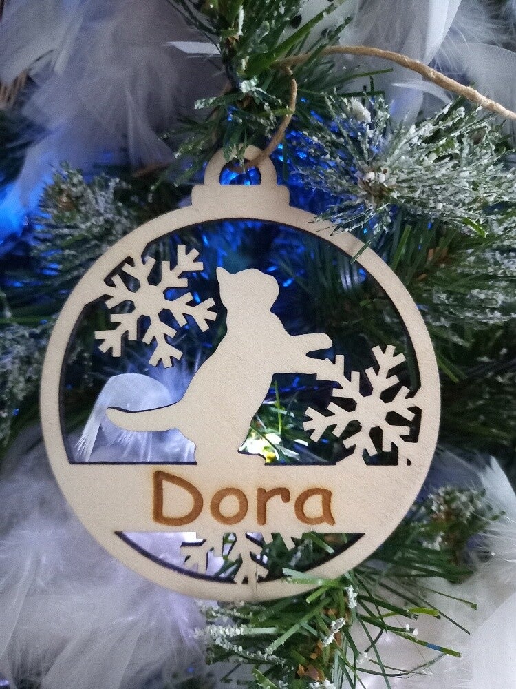 Gepersonaliseerde houten Kersthanger met naam van je kat in gegraveerd.