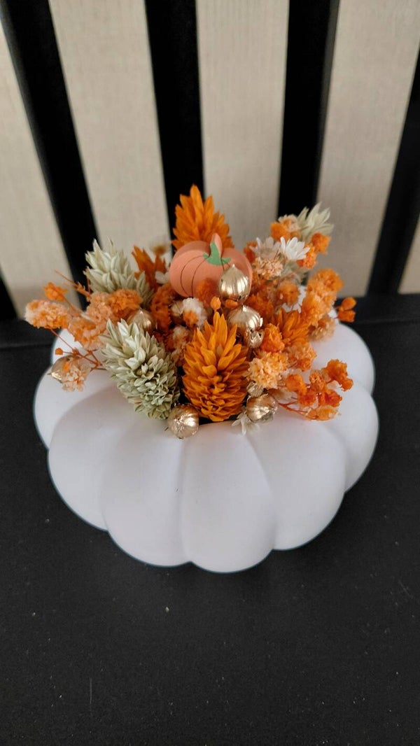 De herfst wordt nog een beetje sfeervoller met deze mooie opgevulde pompoen met droogbloemen .