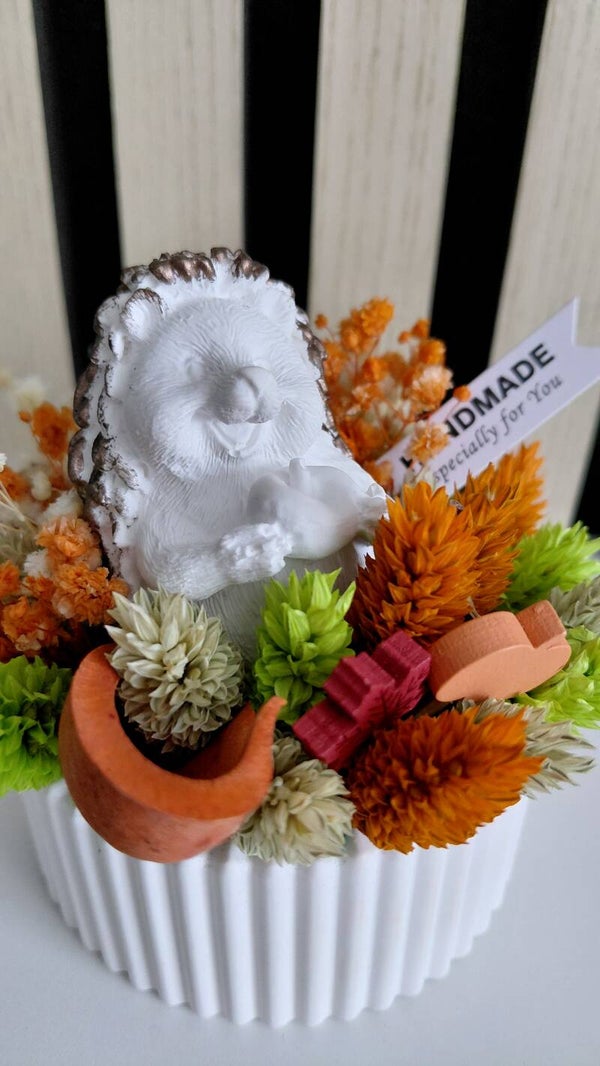 De herfst wordt nog een beetje sfeervoller met deze mooie opgevuld potje met droogbloemen en egeltje in .