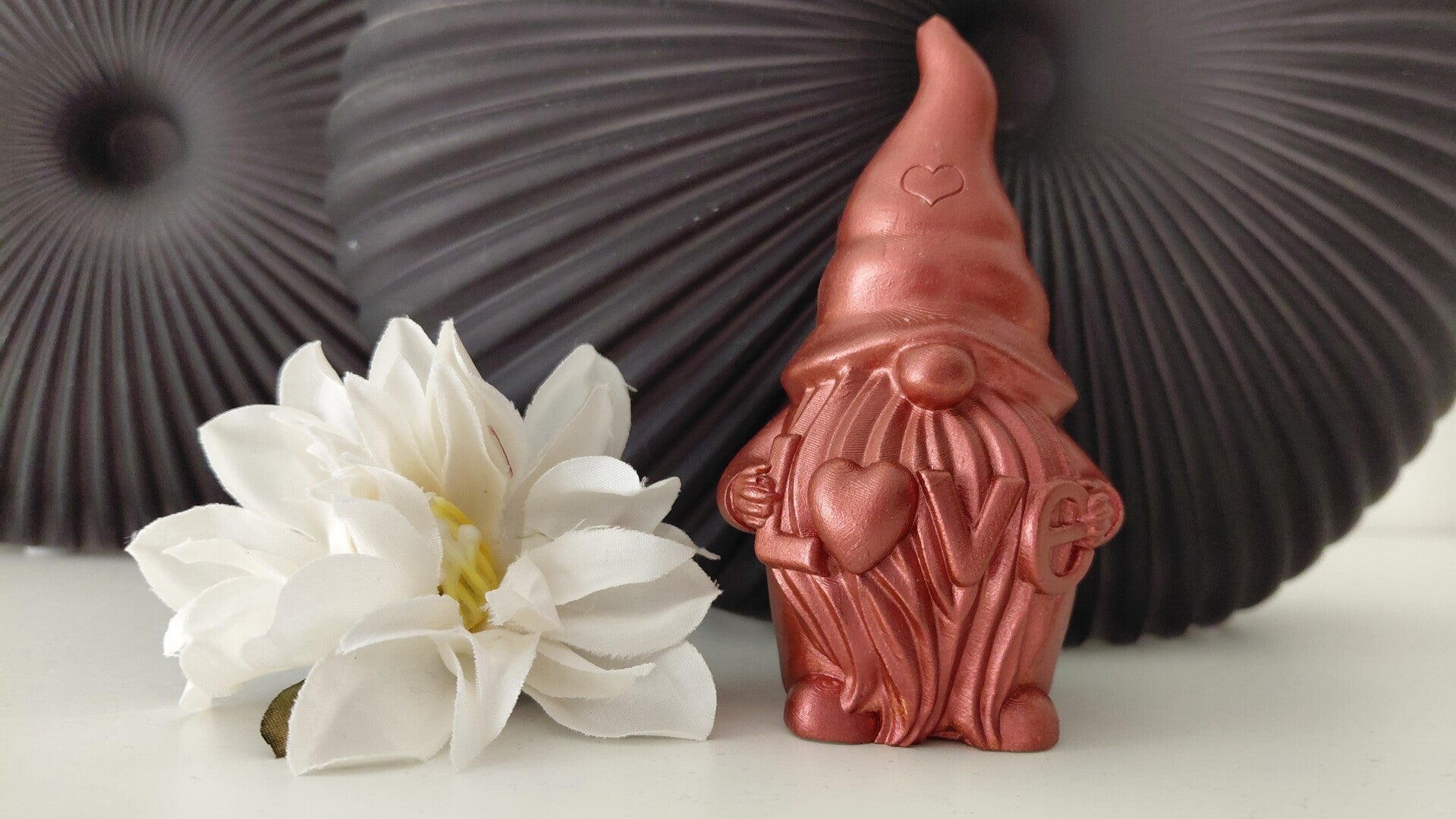 Deze handgemaakte leuke gnoom love is gemaakt van porseleingips en is met de hand geschilderd .